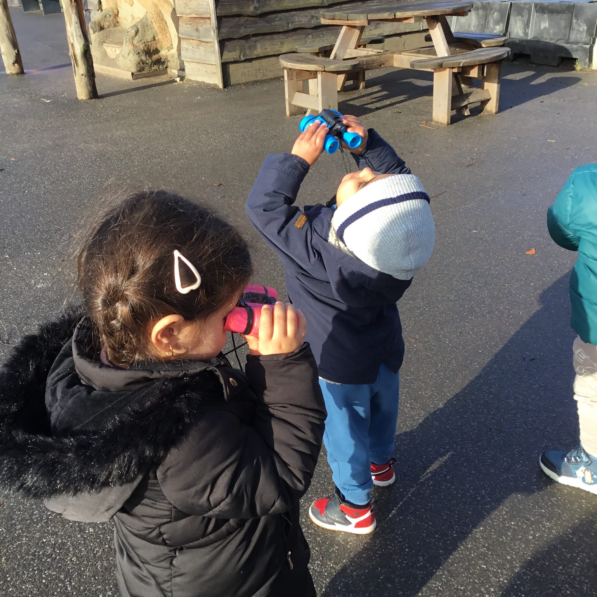 We explored our outdoor area with binoculars, looking up into the sky and peering into the treetops to see what kinds of birds we could find. The children were so excited each time they spotted movement, wings flapping, or a bird perched high on a branch.
